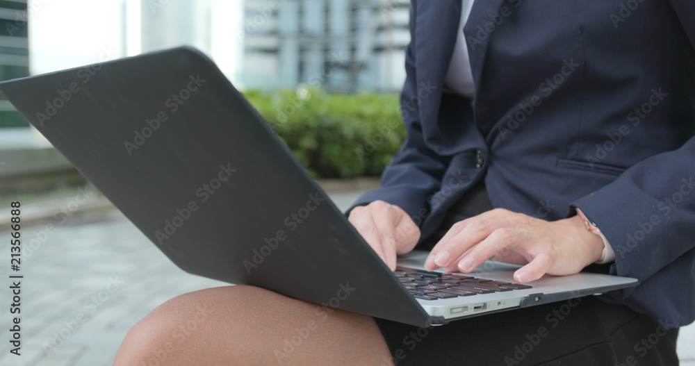 Fototapeta Businesswoman type on laptop computer at outdoor