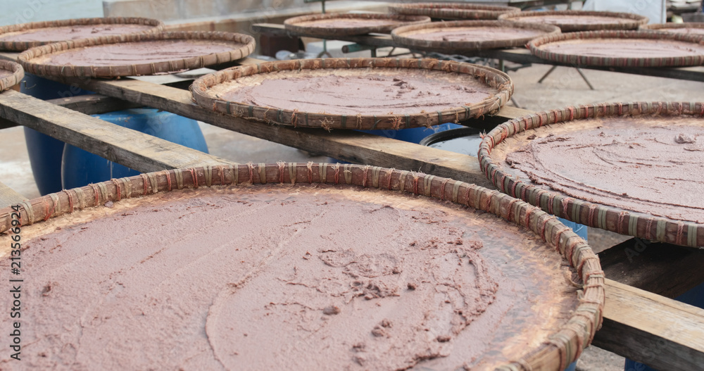 Fototapeta Shrimp paste being dried under the sun in Tai O