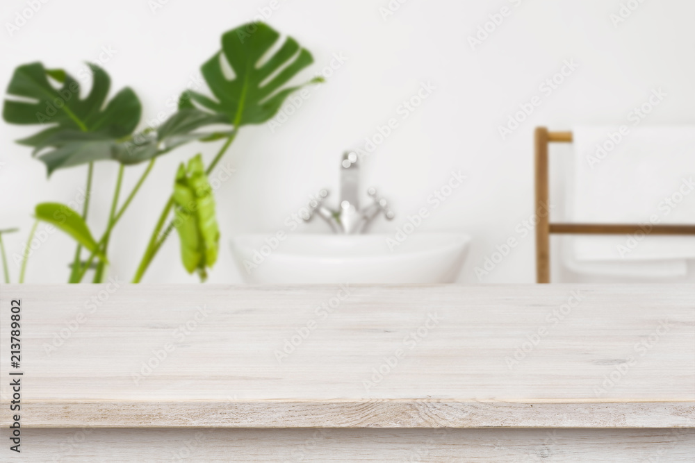 Fototapeta Wooden table top for product display over blurred bathroom interior