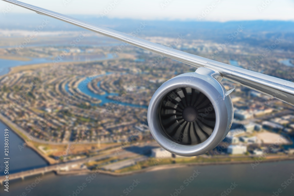 Fototapeta airplane engine above the of Redwood Shores State Marine Park and Foster city