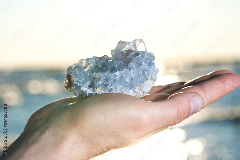 Fototapeta Blue Celestite cluster from Madagascar in woman's hand at sunrise in front of the lake