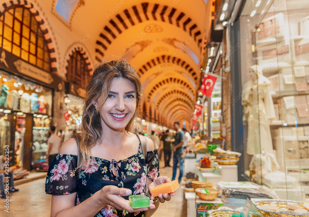Fototapeta Beautiful woman looks traditional soaps in Egypt Bazaar