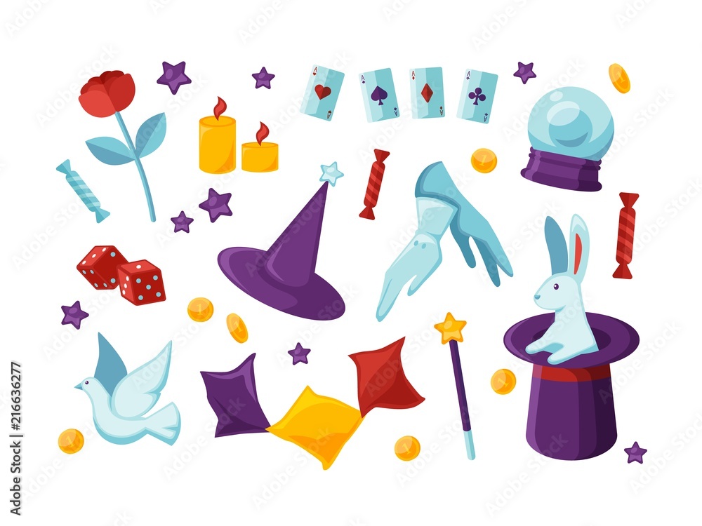 Fototapeta Bundle of equipment and tools for performing magic show and magical tricks isolated on white background - bunny sitting in top hat, playing cards, white dove