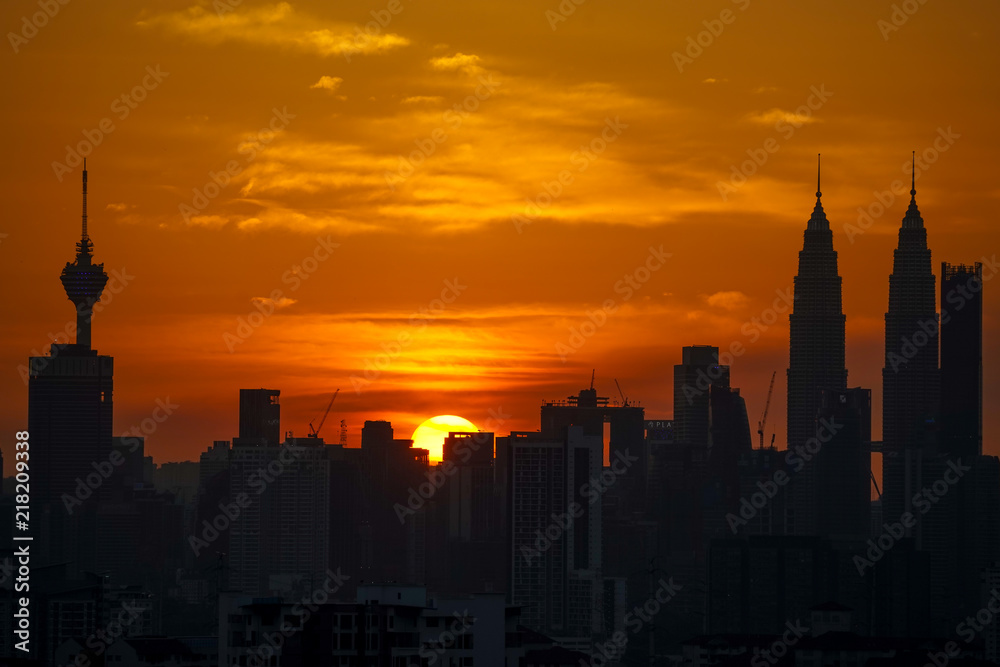 Fototapeta Majestic sunset over Twin Towers and surrounded buildings in downtown Kuala Lumpur, Malaysia