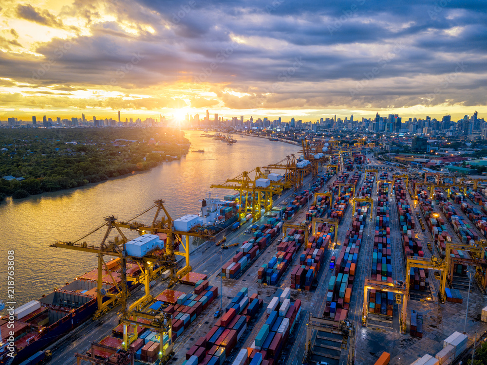 Fototapeta Aerial view of international port with Crane loading containers in import export