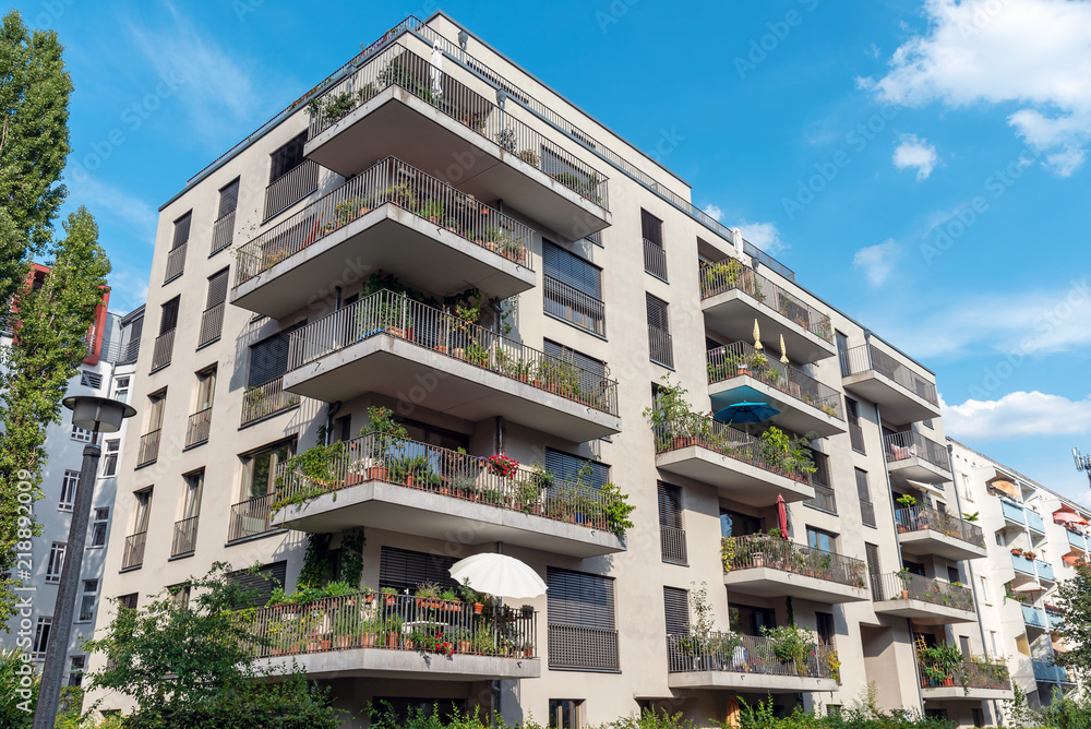 Fototapeta Modern grey apartment building with big balconies seen in Berlin, Germany