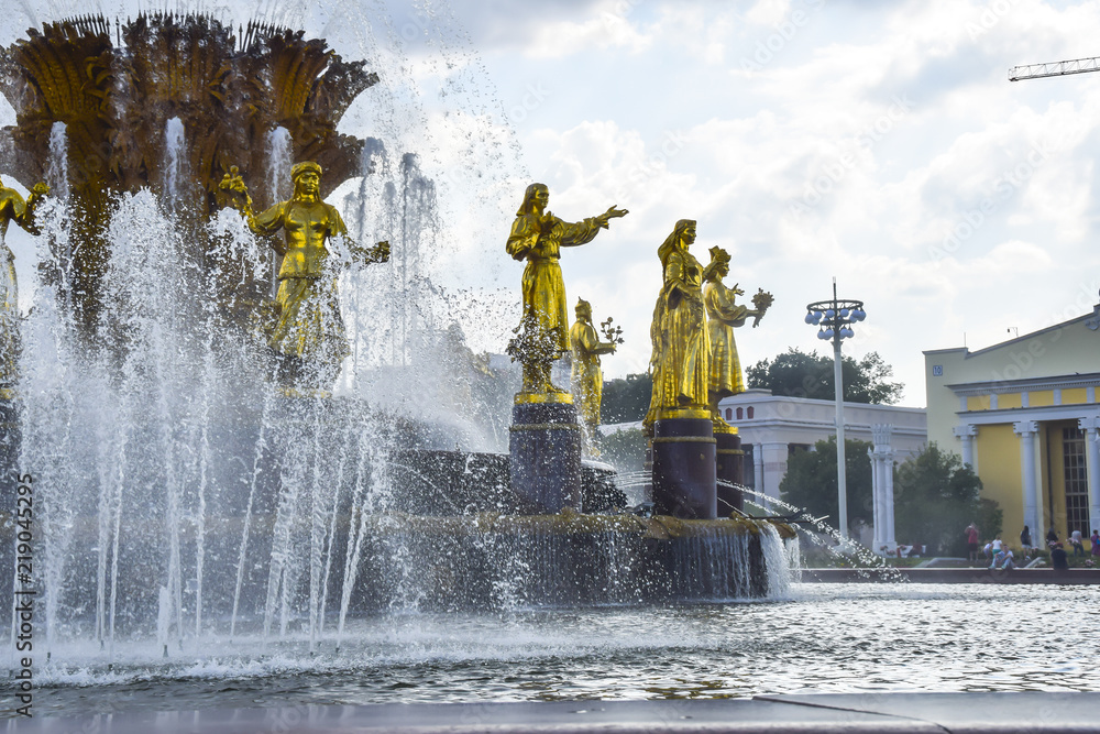 Fototapeta golden fountain of peoples friendship in moscow summer water blue sky