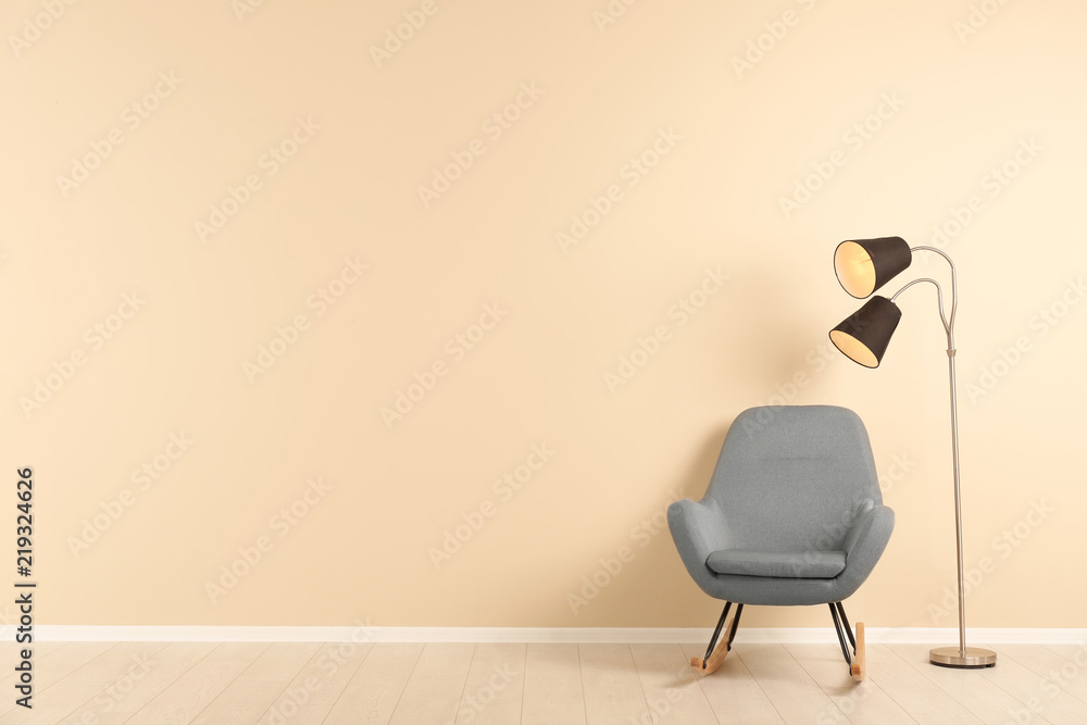 Fototapeta Stylish living room interior with comfortable armchair and space for text