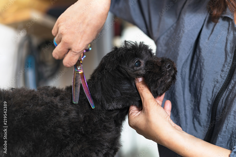 Fototapeta Groomer cutting hair of small dog at a salon in the beauty salon for dogs