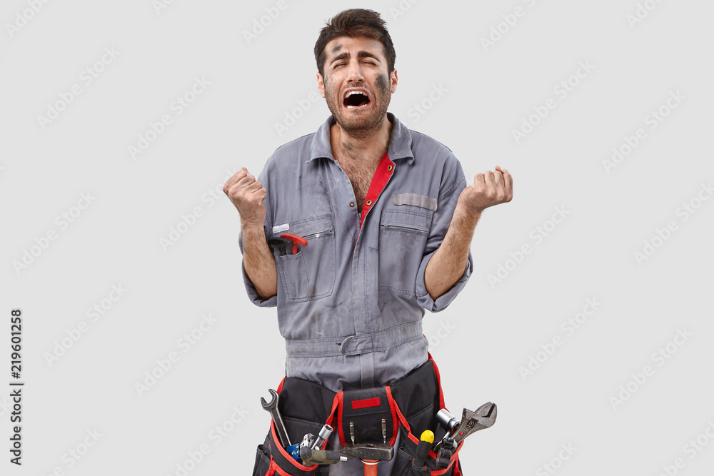 Fototapeta Photo of downcast stressed engineer clenches fists desperately, being despondent