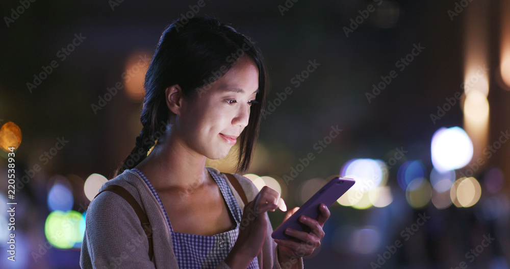 Fototapeta Woman use of smart phone in city at night