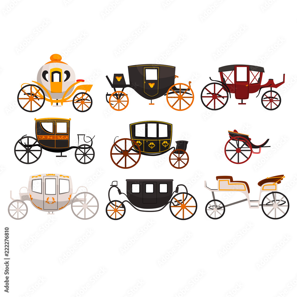 Fototapeta Retro carriages set, vintage transport, brougham, cab, wagon for traveling, wedd