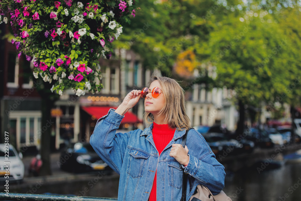 Fototapeta Young girl in red sweater and orange sunglasses with backpack at bridge in Amsterdam street