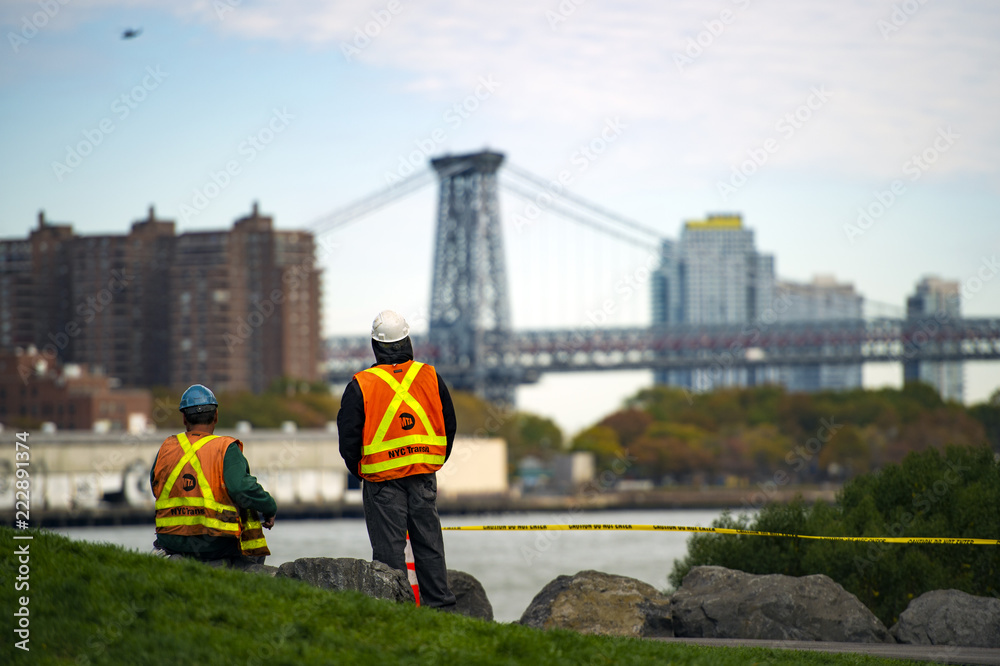 Fototapeta Two NYC Transit workers are taking a break from work and watching the beautiful Manhattan skyline in New York, USA
