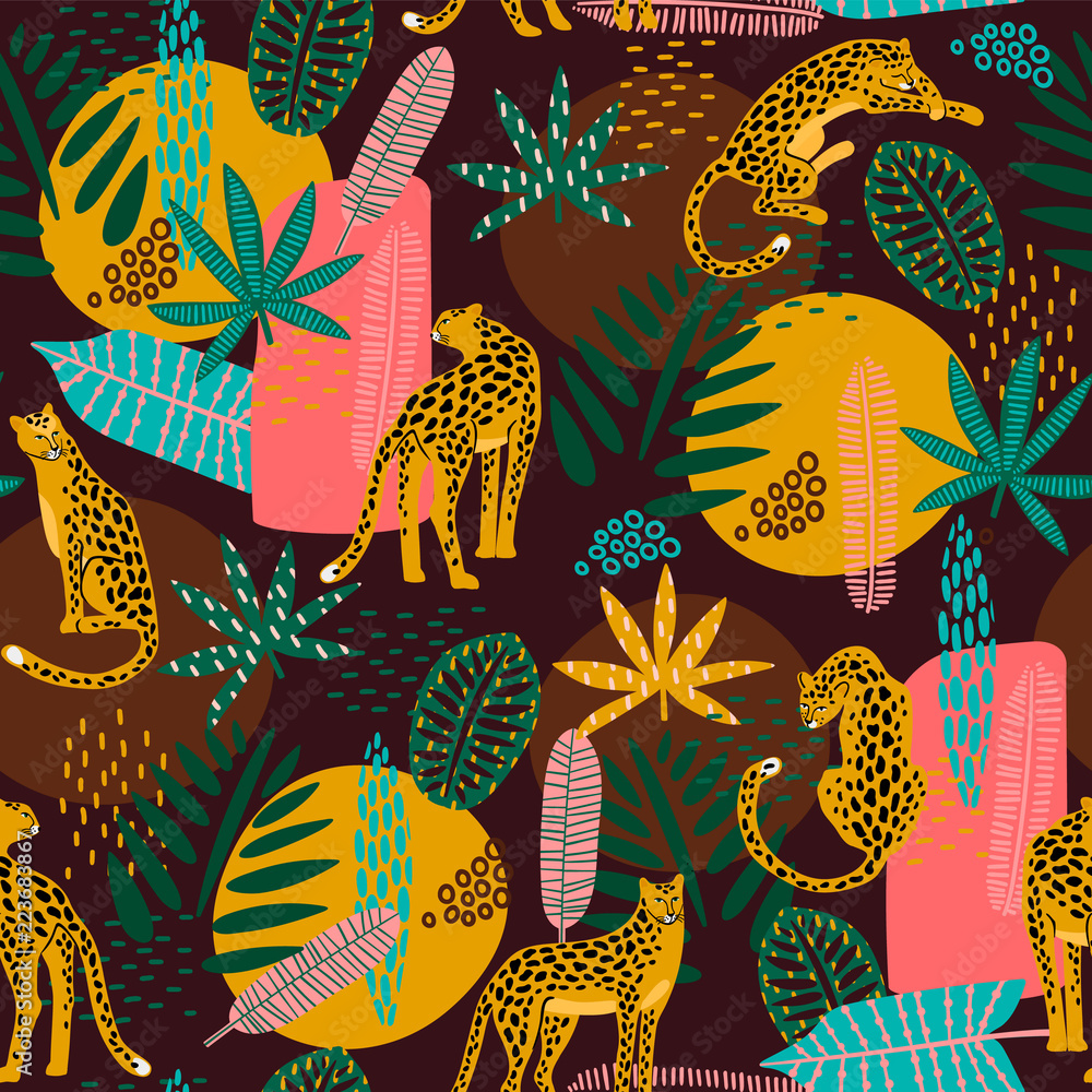 Fototapeta Vestor seamless pattern with leopards and abstract tropical leaves