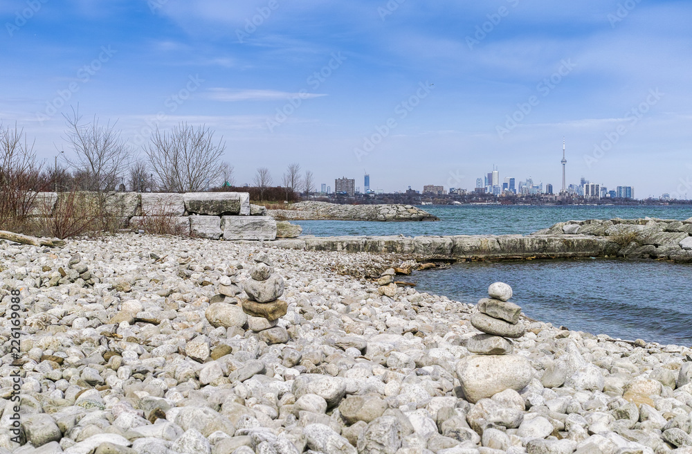 Fototapeta Rocky beach at Lake Ontario wih view of Toronto skyline