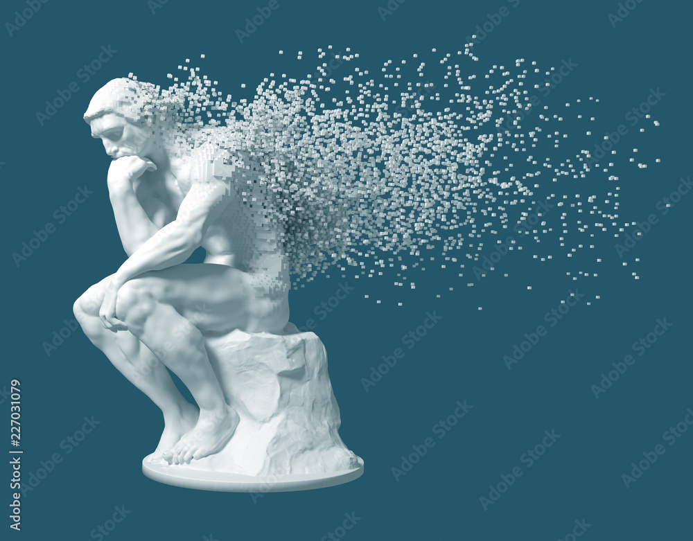 Fototapeta Desintegration Of Sculpture Thinker On Blue Background