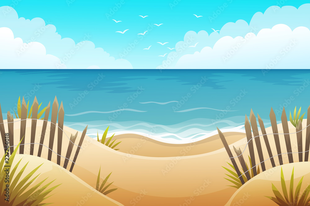 Fototapeta Scenery of sand dunes beach with grass and wood fences