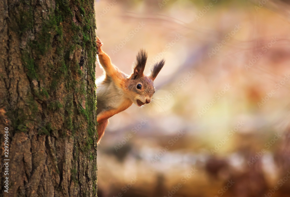 Fototapeta animal red-haired funny squirrel in the autumn Park Peeps out of the tree trunk
