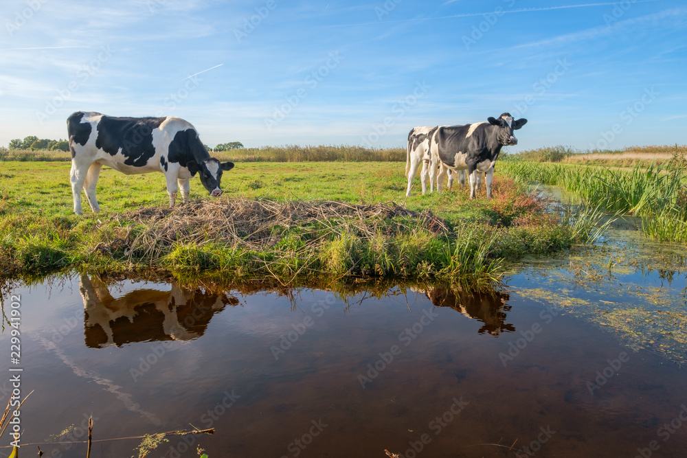 Fototapeta Curious young cows in a polder landscape along a ditch, near Rotterdam, the Neth