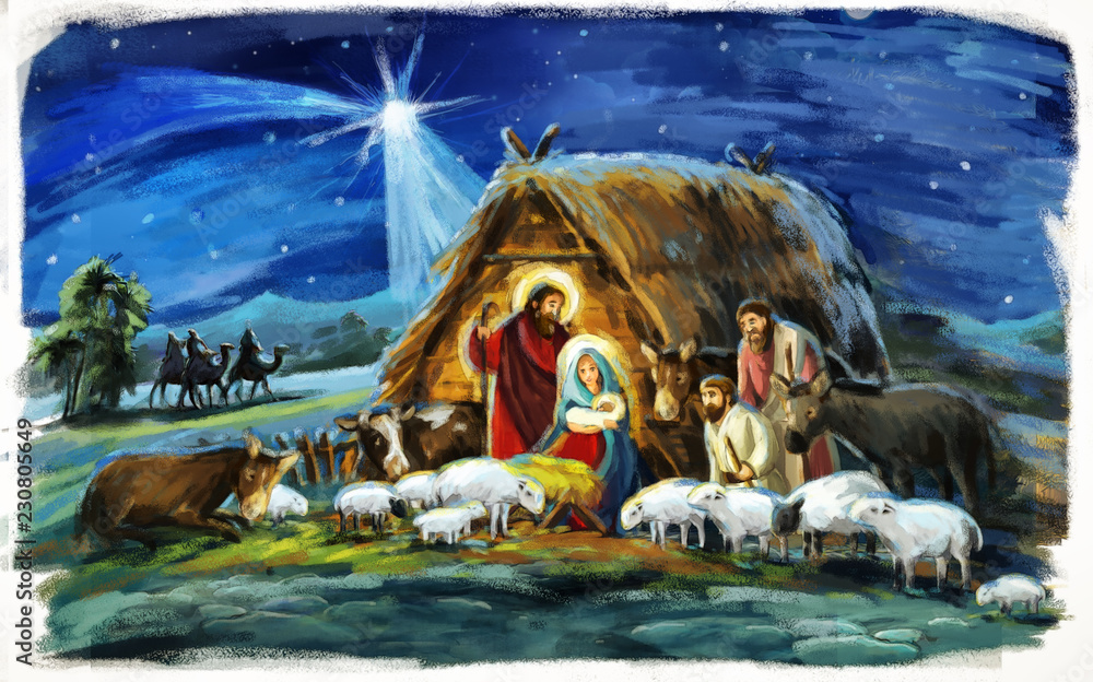 Fototapeta religious illustration three kings - and holy family - traditional scene with sh