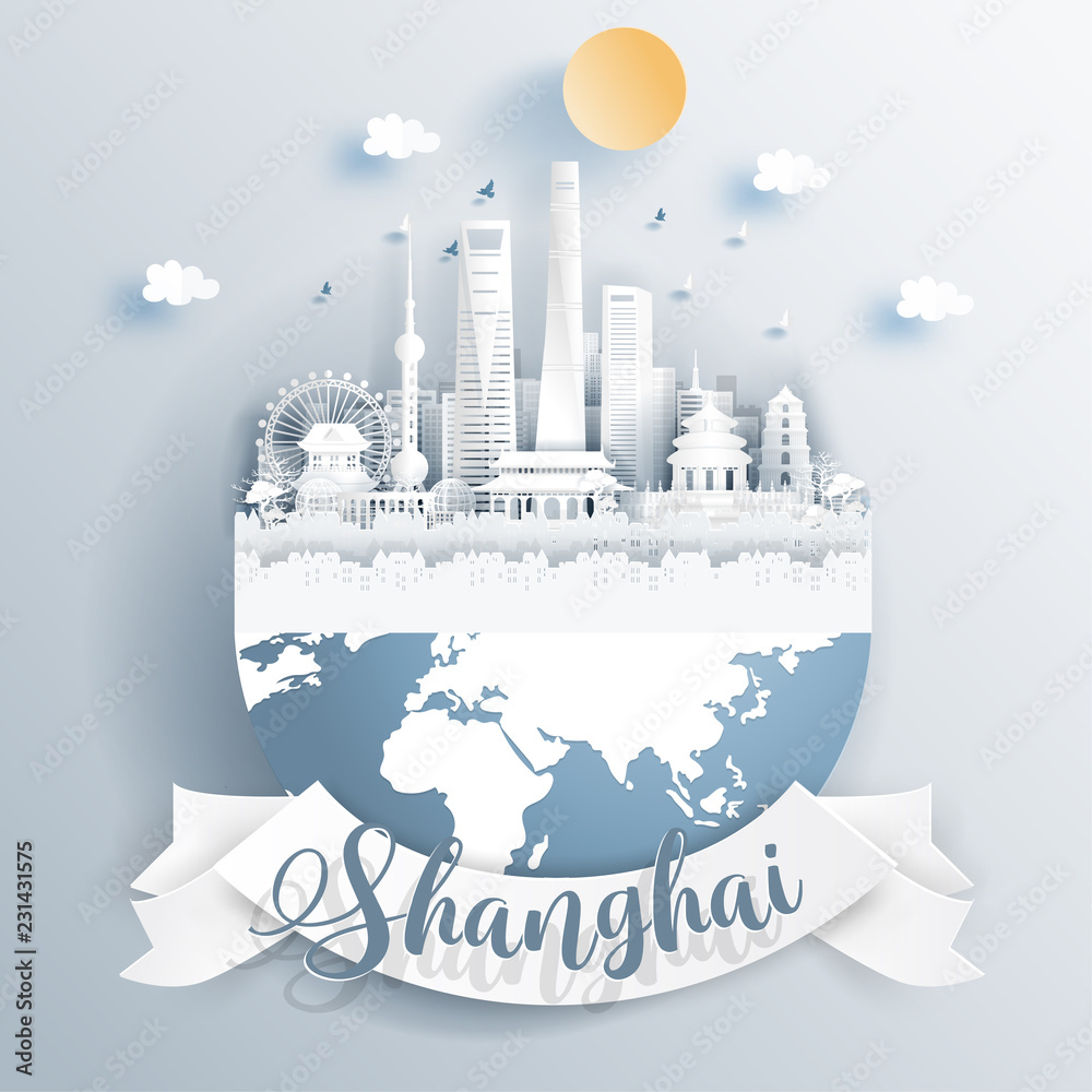 Fototapeta Shanghai, China landmarks on earth in paper cut style vector illustration