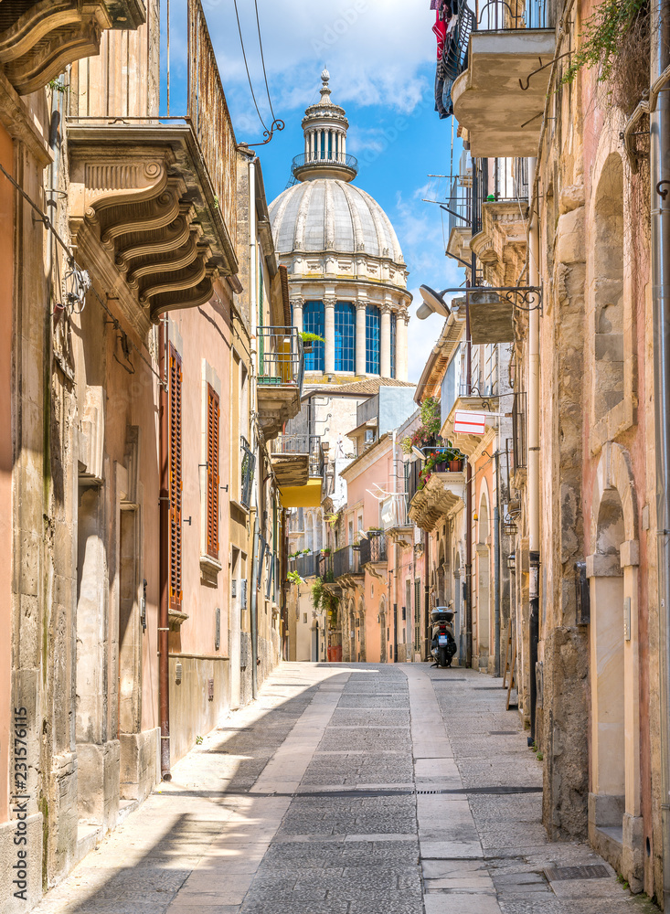 Fototapeta A narrow and picturesque road in Ragusa Ibla with the dome of Saint George Duomo