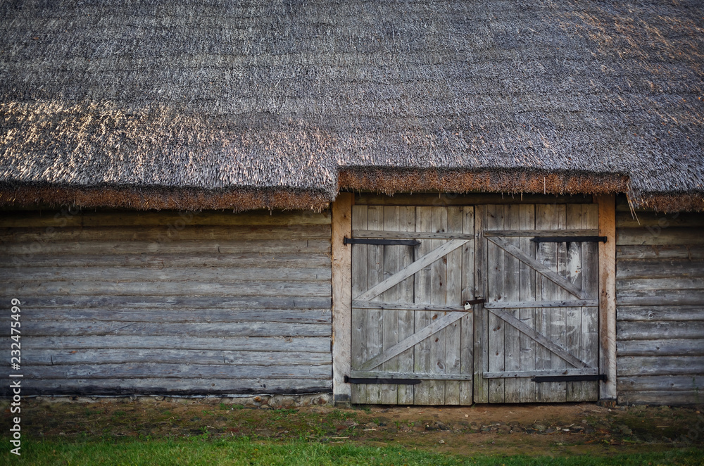 Fototapeta Old wooden barn. Log wall, gate and thatched roof.