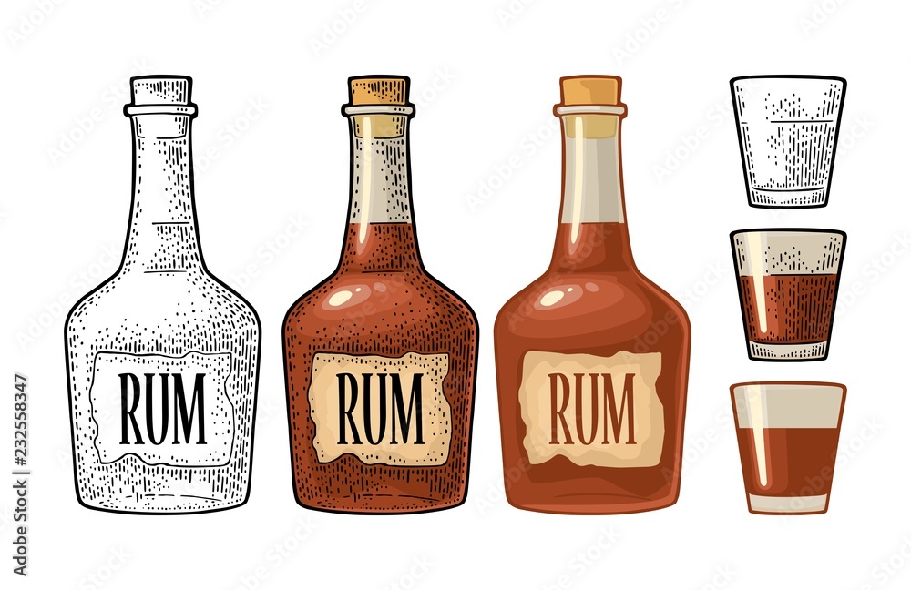 Fototapeta Bottle and glass rum with craft label. Vintage color engraving