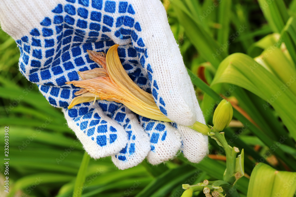 Fototapeta Gardener's hand removing (deadheading) of a faded flower of a cultivar daylily (Hemerocallis sp