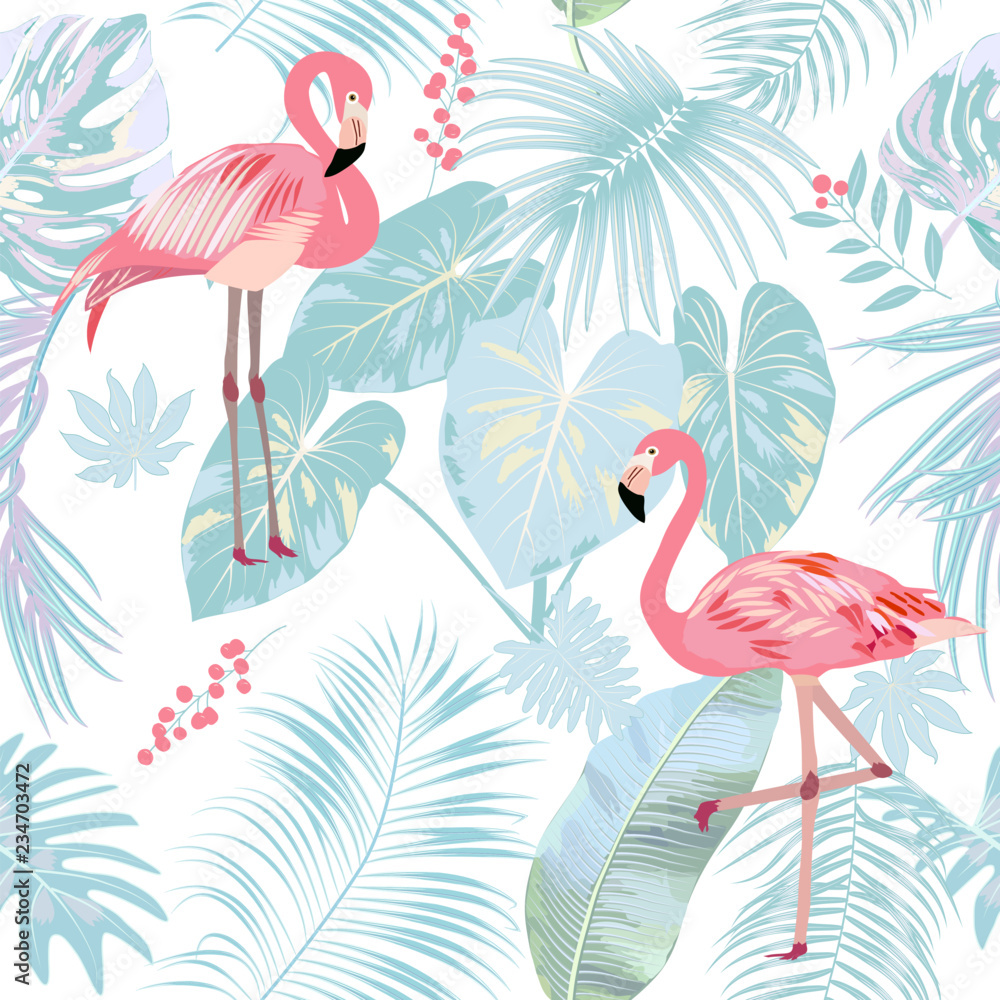 Fototapeta Seamless pattern of flamingo, leaves monstera