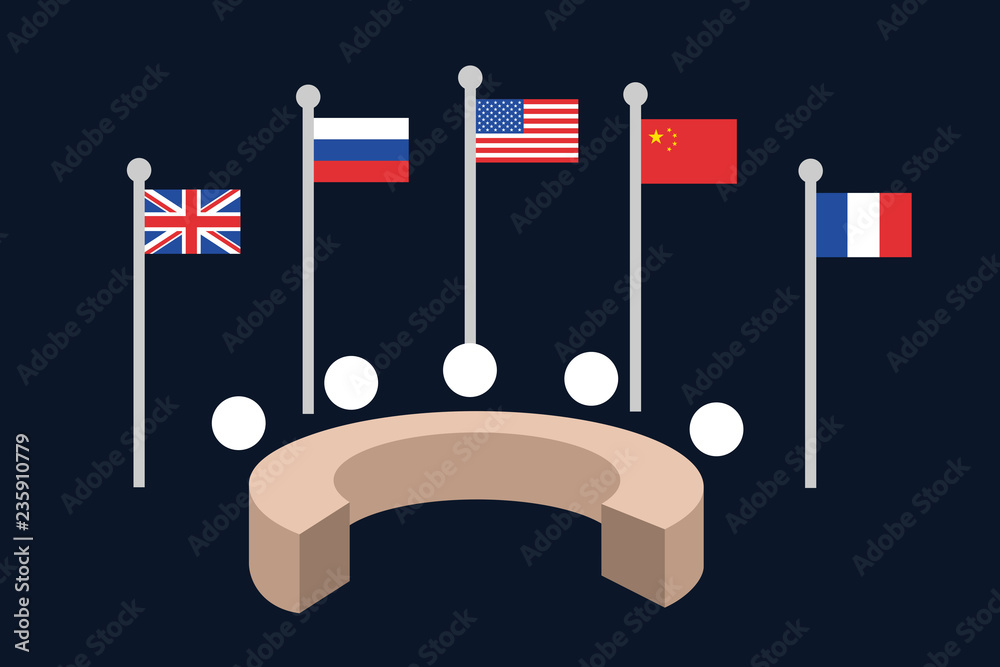 Fototapeta United Nations Security council - five permanent member states and countries ( Great Britain, Russia, USA, China, France) are meeting around round table to achieve peace