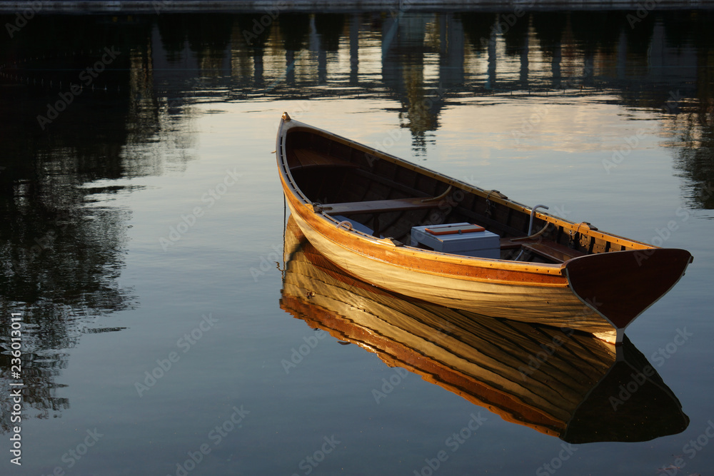 Fototapeta Empty rowboat on water with reflection