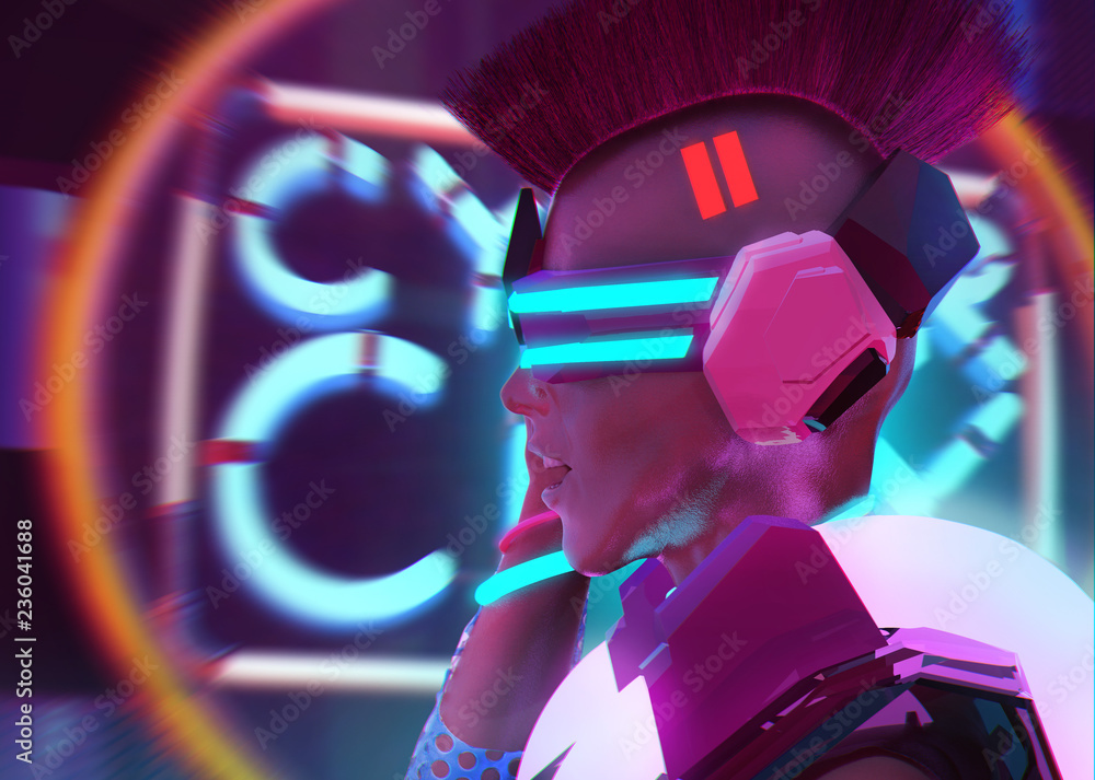 Fototapeta Sci-fi cyber robot punk girl in armor suit portrait profile.