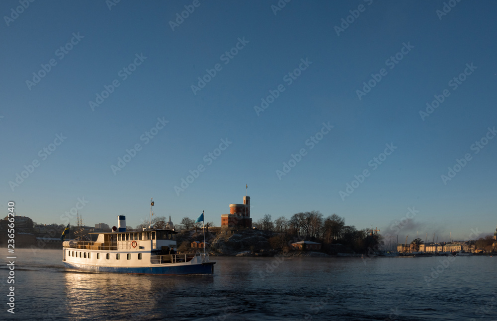 Fototapeta A sunny morning in stockholm harbour, ships and boats in the frosty mist and win