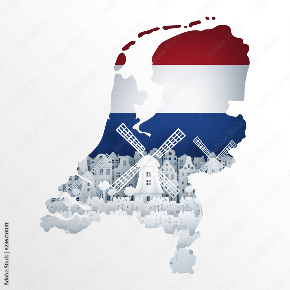 Fototapeta Holland map concept with Dutch windmill for travel postcard and poster, brochure, advertising in paper cut style vector illustration