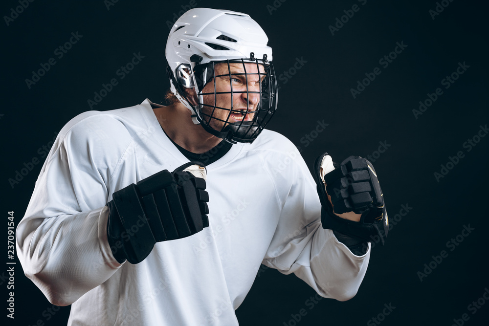 Fototapeta A young hockey player in white uniform with protective gloves, standing in defensive stance