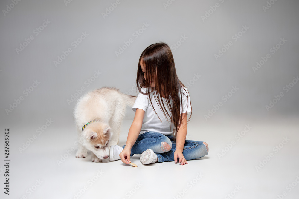 Fototapeta Portrait of a joyful little girl having fun with siberian husky puppy on the floor at studio