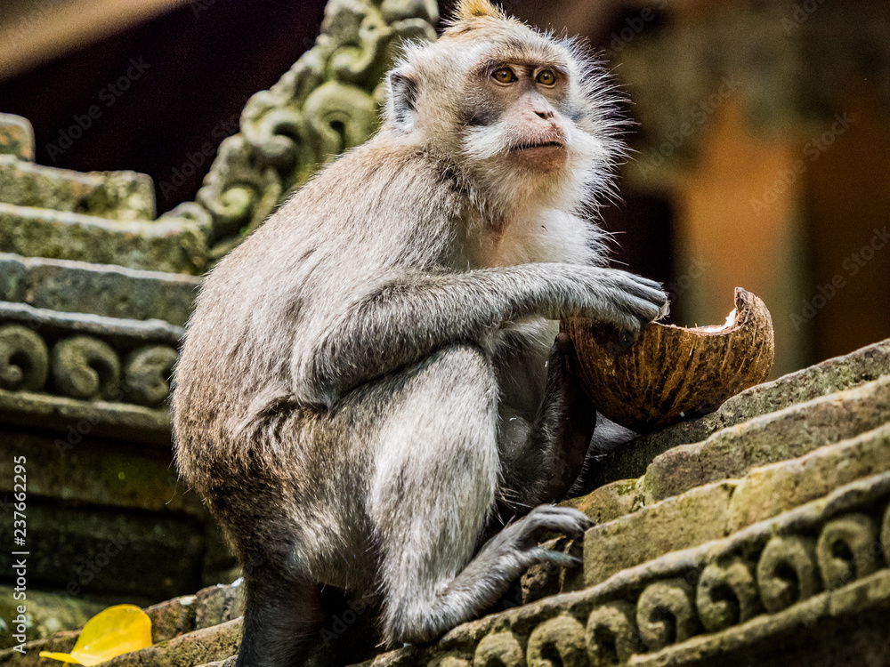 Fototapeta Wild monkey sitting alone on an ancient temple wall eating from a coconut shell