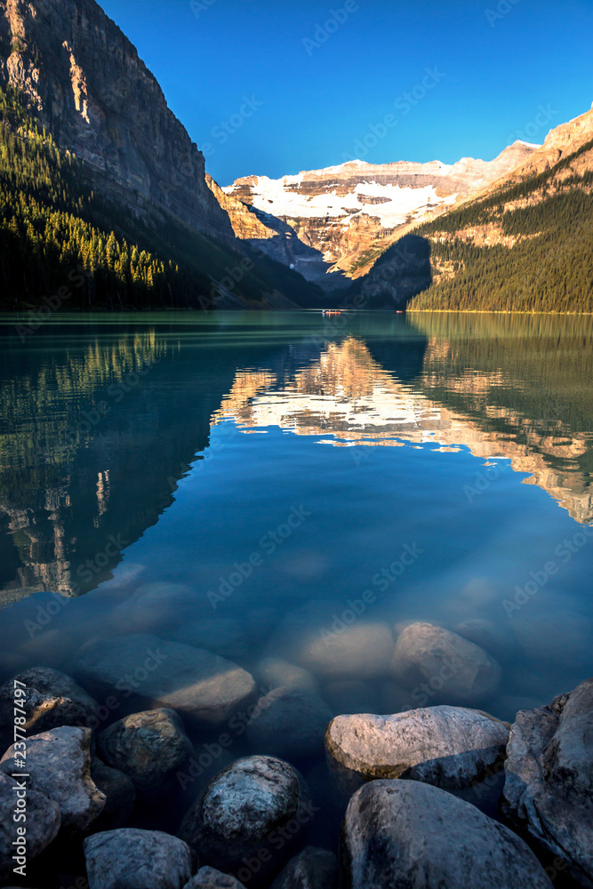 Fototapeta Water reflection with rocks in the foreground and snowcape in the background in