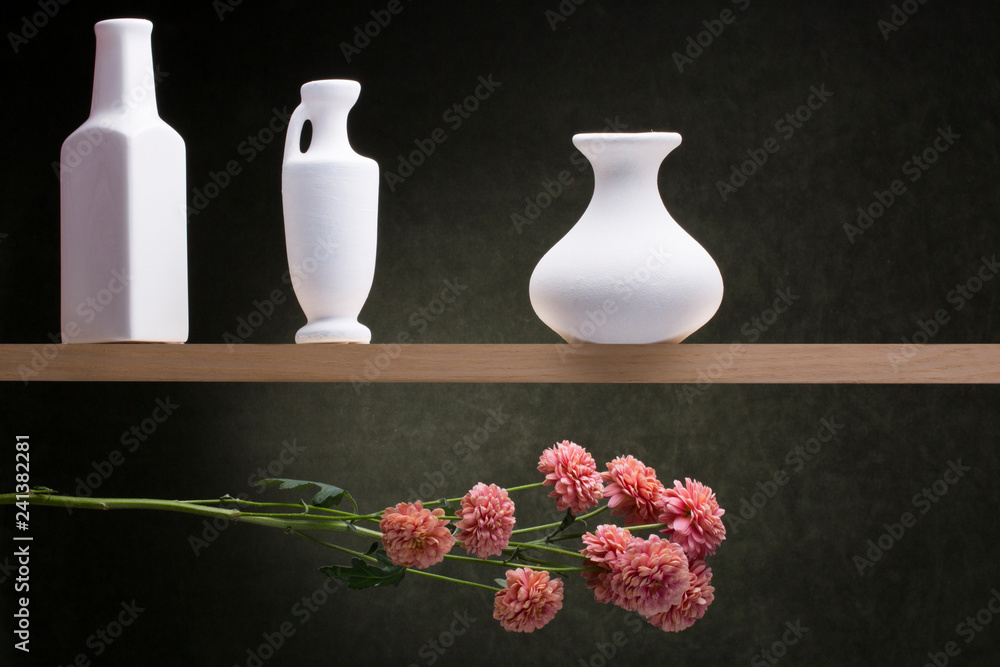 Fototapeta Still life with white vases and a flower branch