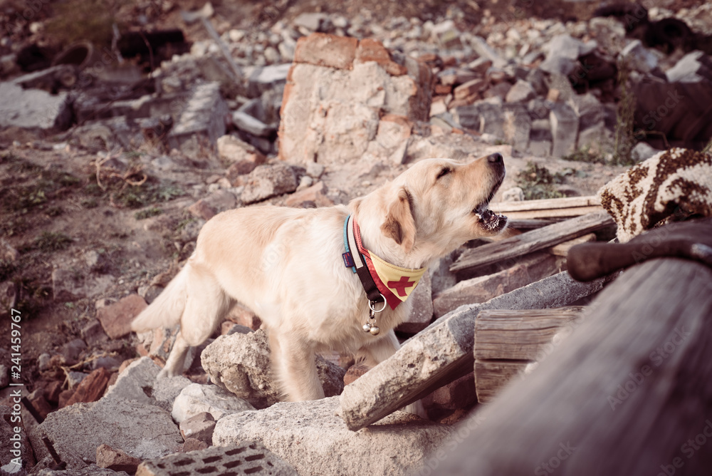 Fototapeta Dog looking for injured people in ruins after earthquake.