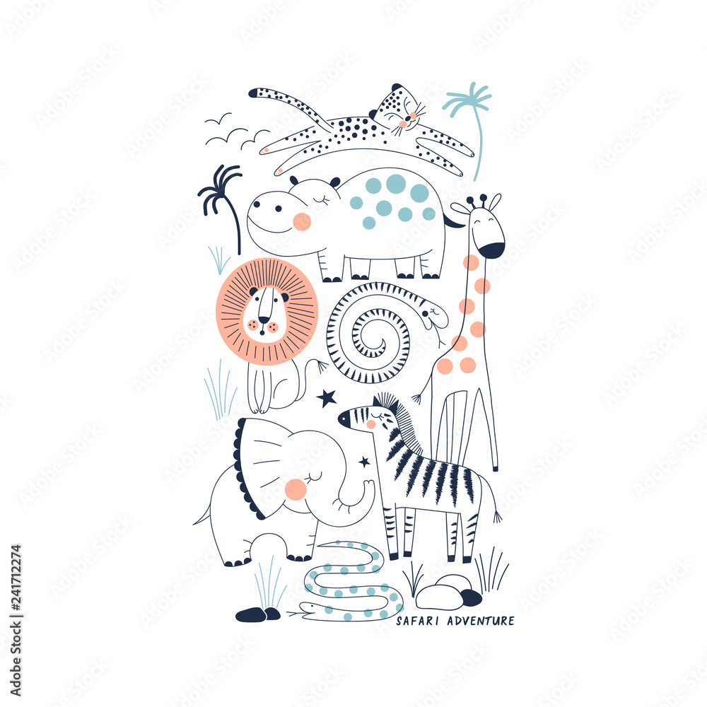 Fototapeta decorative orange and navy blue savannah wildlife illustration with animals leop