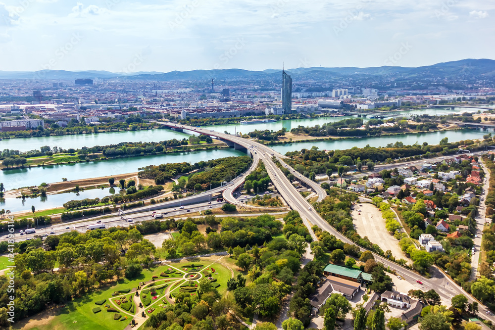 Fototapeta Vienna highways and bridges over the Danube, aerial view