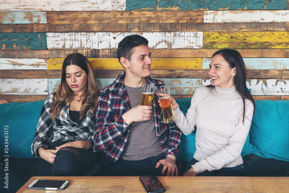 Fototapeta Man toasting and drinking beer with cheerful woman ignoring jealous girl sitting