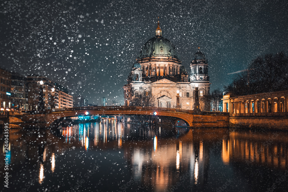 Fototapeta Berlin Cathedral (Berliner Dom) on Spree river snowing in winter time
