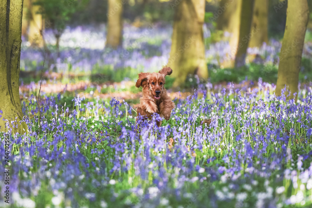 Fototapeta A cocker spaniel playing among bluebells in the woods