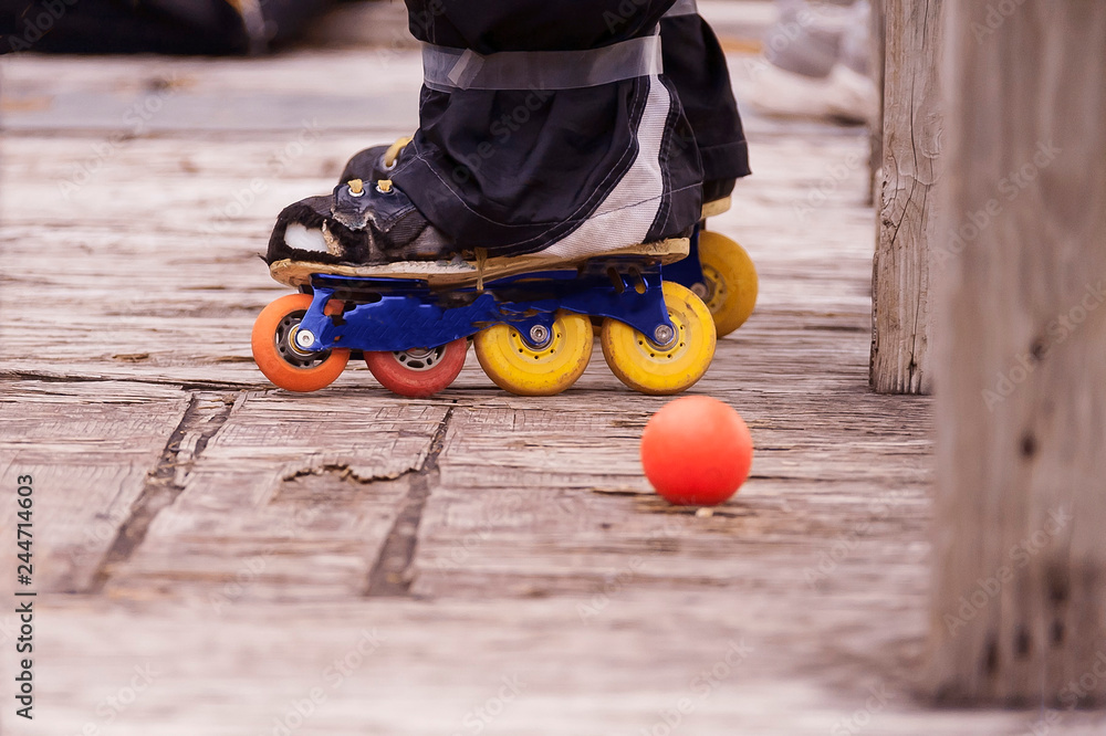 Fototapeta hocky players skates while he is standing befine the bench