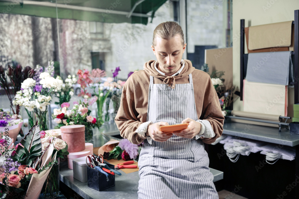 Fototapeta Concentrated bearded man looking at screen of his gadget