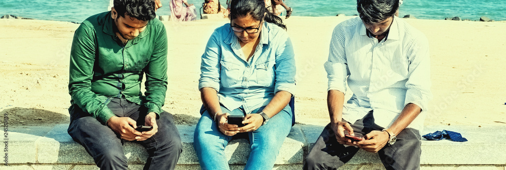Fototapeta Two men one woman taking selfies at the beach with sea in background
